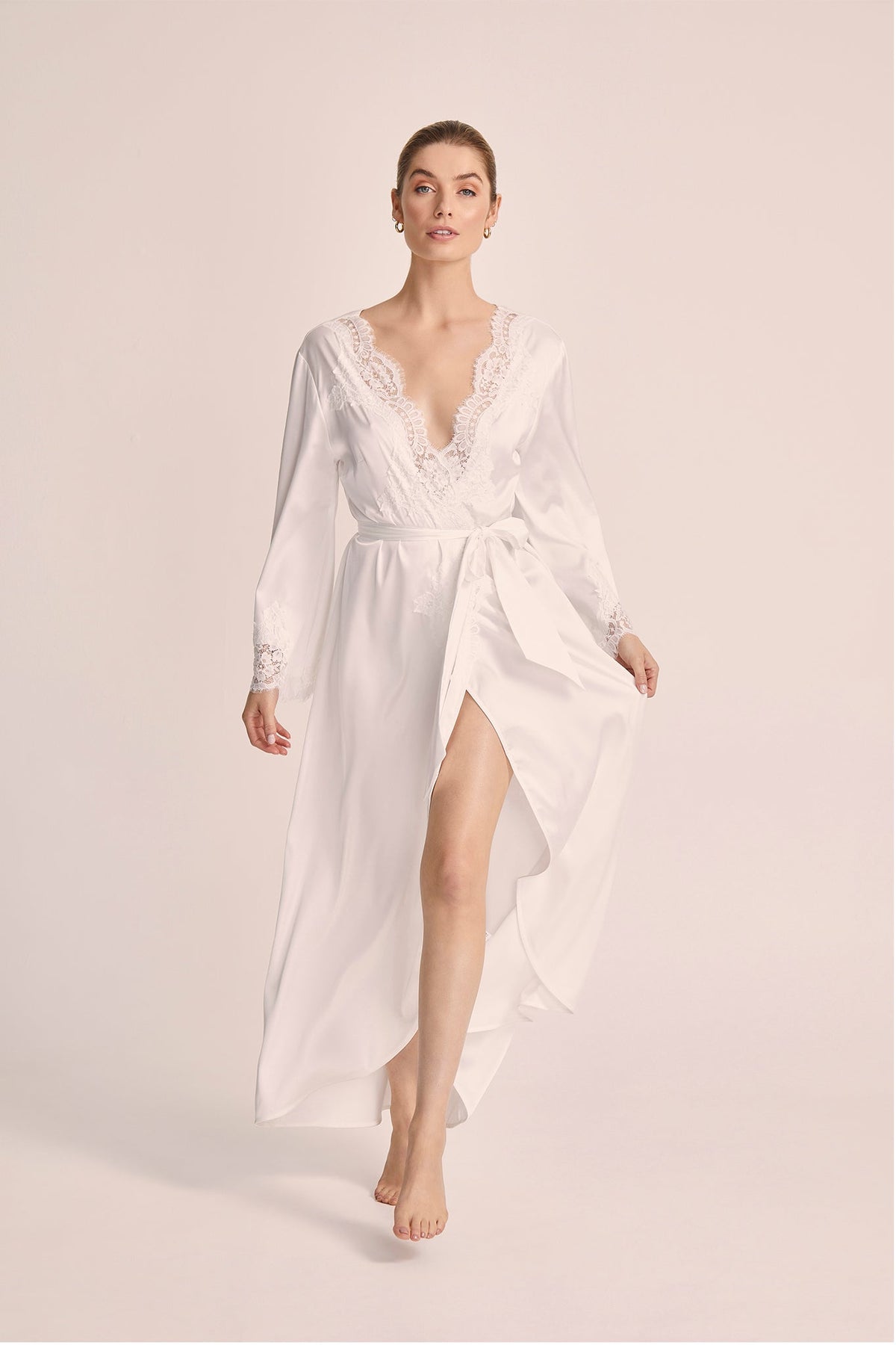 חלוק SIAN LACEהארוך עשוי סאטן רך ותחרת כותנה עדינה, בגזרה מחמיאה עם חגורת קשירה שמדגישה את קווי הגוף בטבעיות. חלוק עם נוכחות שקטה - נשי, אלגנטי ומדויק, לרגעים מיוחדים ולאינטימיות יומיומית.